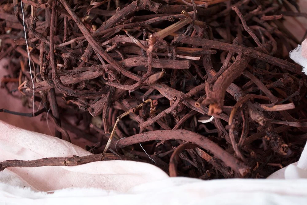 The saturated, ramified root of the Rubia tinctorum is filled with Alizarin pigment. Since ancient times Rubia tinctorum, known as madder, or madder root, played a central role as a dye plant. In European culture it has been sold for medical or colouring purposes for thousands of years. Emperor Charlemagne brought it to Aachen and with the help of madder the region became more wealthy and prosperous. After the rise of synthetic colours it disappeared from the fields. Nowadays just bewilderd plants live here. They are mostly regarded as insignificant weeds.
