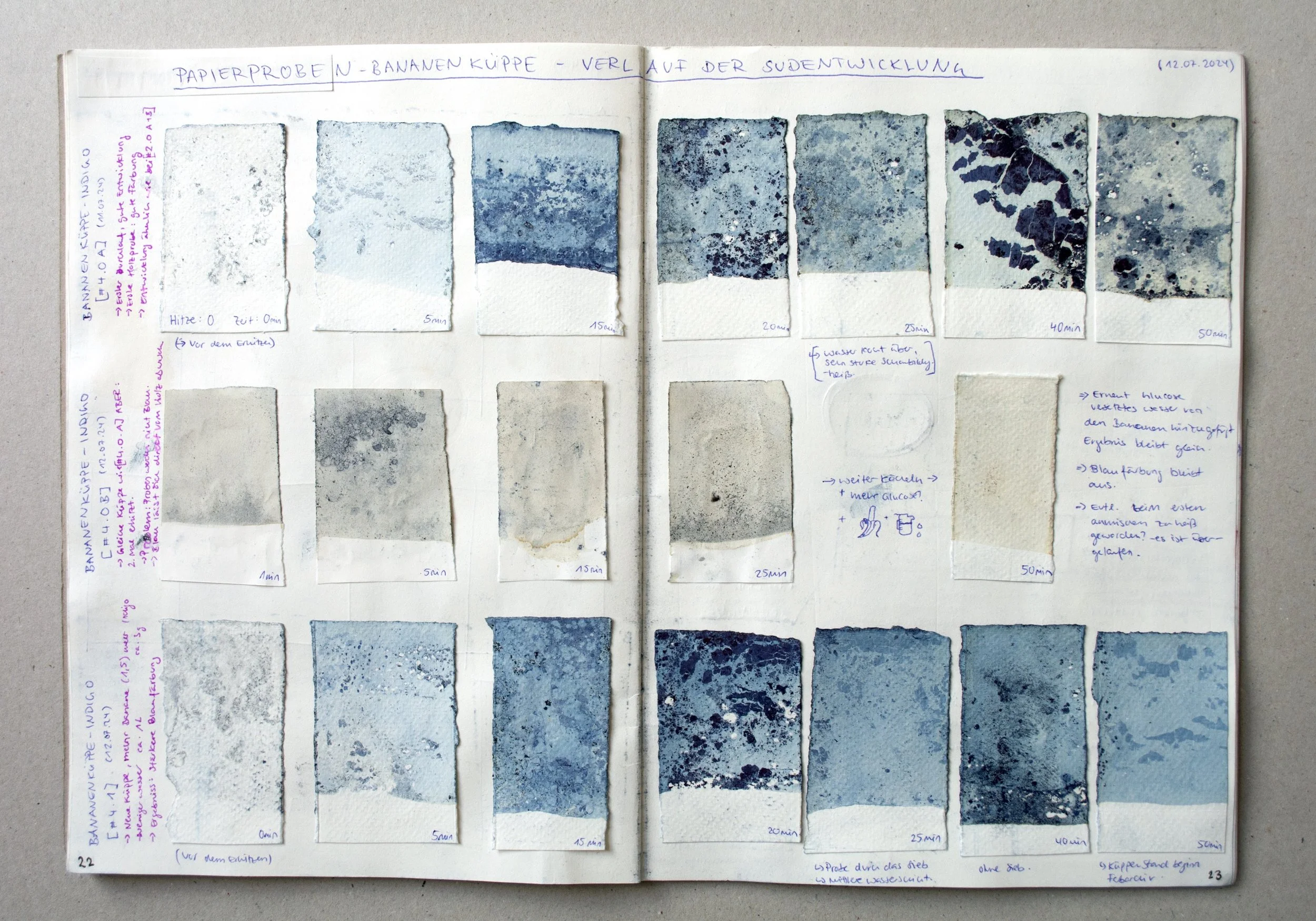 In following traditional recipes we experience the vat dyeing process, its difficulties and sensory effects. Observing the transitions of the colour while processing the vat and being in contact with oxygen is just one part of a complex recognition. A traditional vat is a well acid-balanced fluid inhabited with bacterial cultures. They multiply, eat and digest. This is the necessary environment to transfom the colour from plant to dye on a molecular scale. In modern times chemical additives accelerated or even replaced the bacteria in vat-dyeing. Bacteria were too demanding for industrial production in high speed. But vat-dyeing is - and always has been - an overwhelming smelly, sweaty and ‘dirty’ process. The skin, the sense of smell and the tools we employ are involved and stained afterwards. But the reward is a deep, intense blue, at times almost black, gained through layering of colour and experiences.
